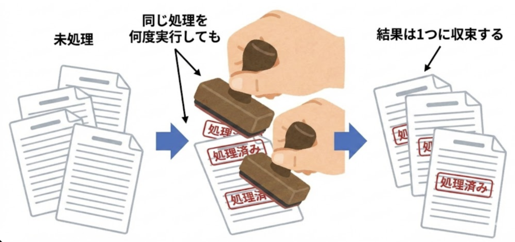 冪等性とは「同じ処理を何回やっても結果が同じ(壊れない)」性質です。難しく聞こえますが、やることはシンプルです。