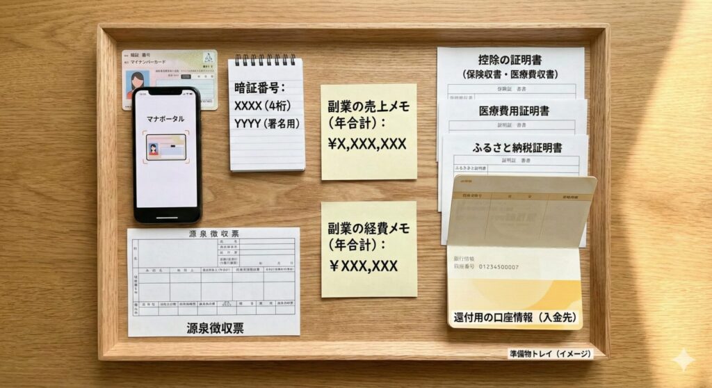 スマホ申告は「画面が小さい」よりも、「途中で探し物が増える」ほうが疲れます。そこで、申告する前に机の上に“準備物トレイ”を作ってください。