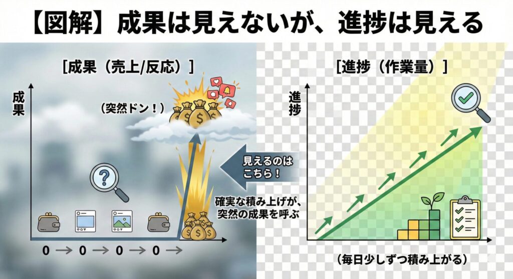 成果はしばらく“ゼロ”が続くのが普通。でも進捗(作業量)は今日から見えます。