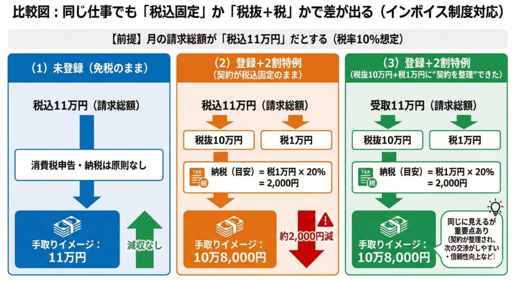 - ステップ2:登録時の手取り影響をラフ試算(固定のまま/単価改定できた)し、損しない条件を作れるか判断する