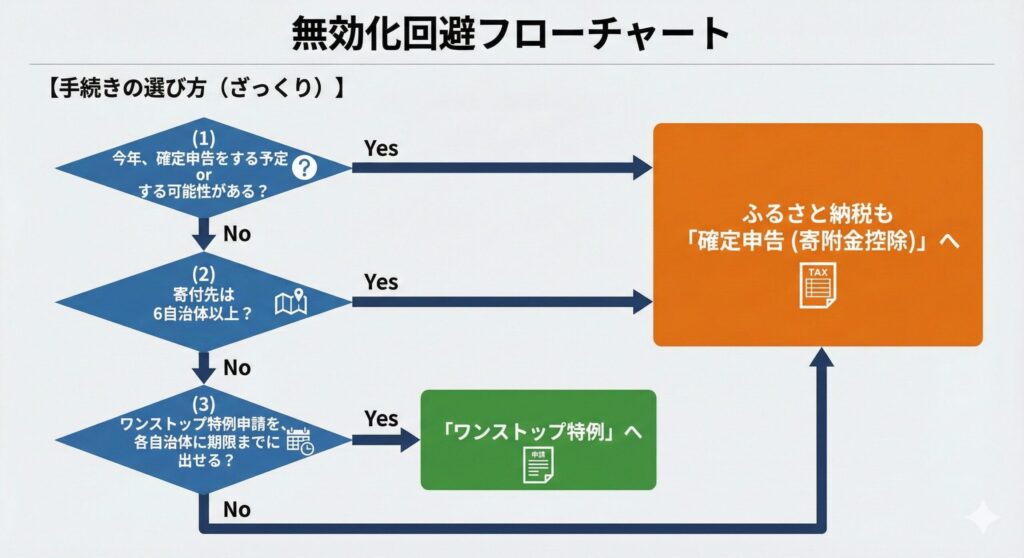 回避策:確定申告をする年は、ふるさと納税も確定申告へ寄せる。ワンストップ提出済みでも、申告で寄附金控除を入れ忘れない。
