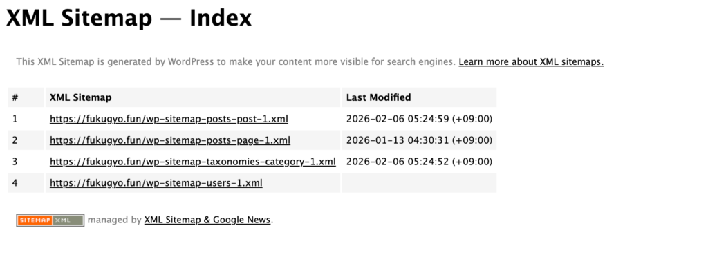 サイトマップ例:https://fukugyo.fun/wp-sitemap.xml