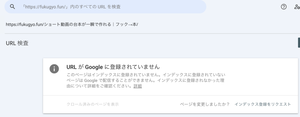 上部の検索欄に記事URLを打ち込むと、Googleに登録されているか判断ができます。登録されていない状態で「インデックス登録をリクエスト」のボタンを押します。