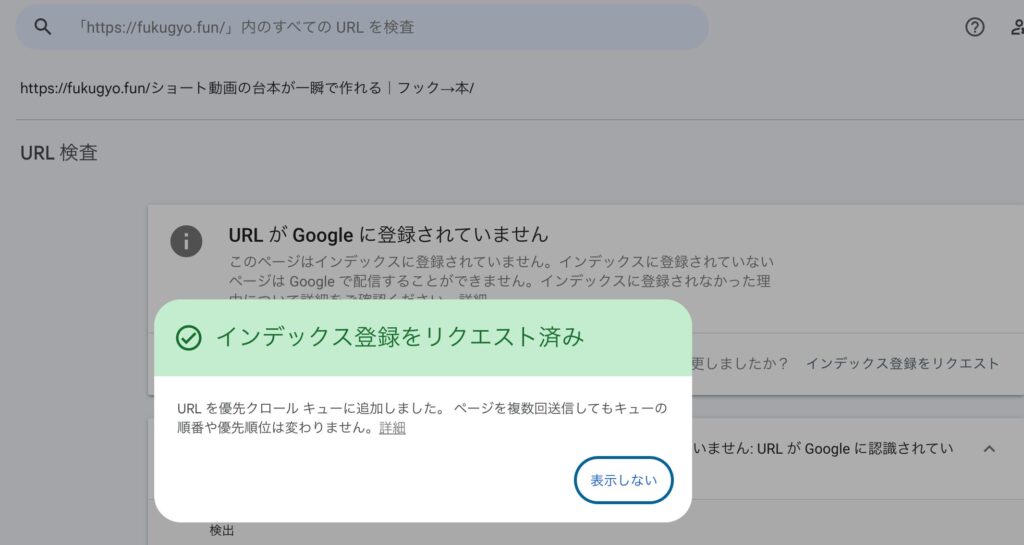 インデックス登録をリクエスト済と出たら完了です。数日待つと、
