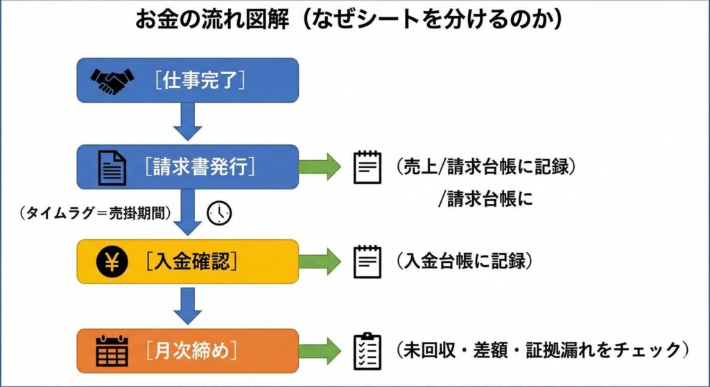 だからこそ、売上(請求)と入金(キャッシュ)を同じ表で管理しようとすると、必ずグチャグチャになります。