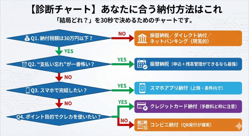 ポイントは「得する方法」より“期限内に確実に払える方法”を選ぶこと。未納や遅れは、結果的に損(延滞税など)になりやすいからです。