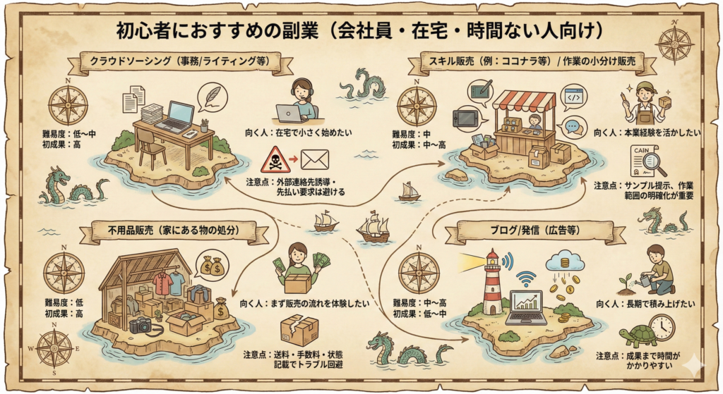 ここでは「副業 おすすめ 会社員」「副業 在宅」「副業 時間ない」を満たしやすく、初成果までの距離が近い選択肢をまとめます。どれも一長一短があるので、“あなたの生活に収まるか”で選んでください。