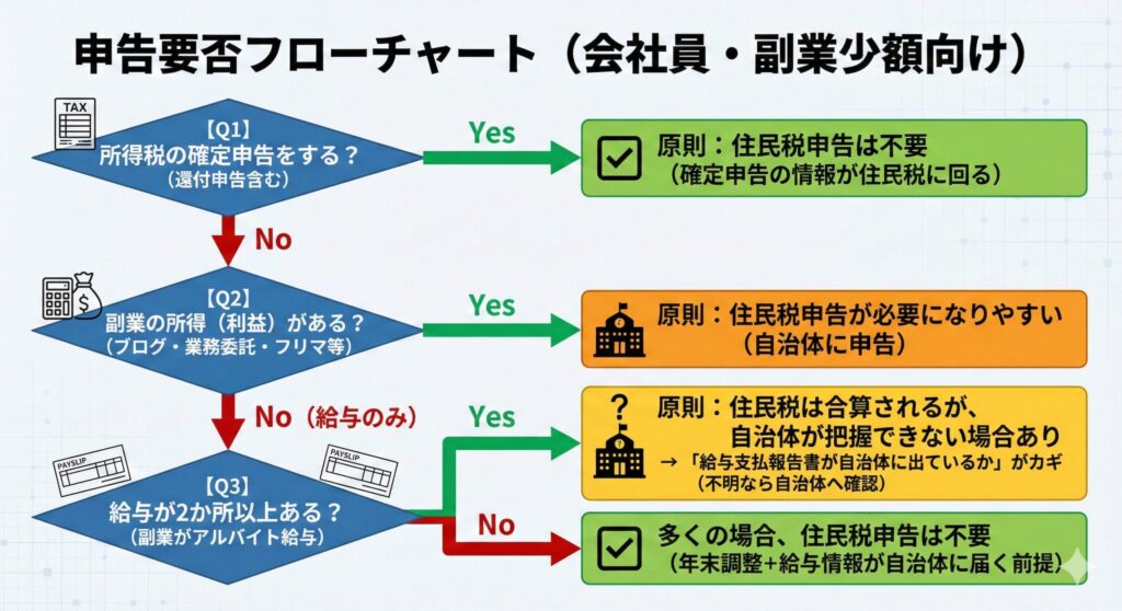 そのため、所得税の確定申告をしない場合は、自治体があなたの副業所得を把握できない限り、住民税申告(市区町村への申告)が必要になるケースが一般的です。