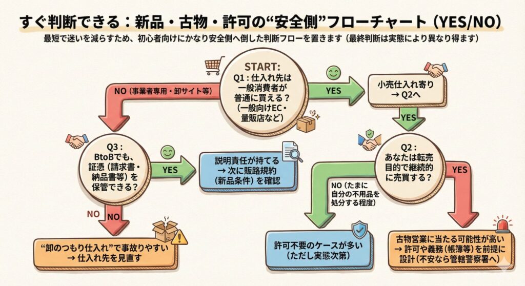 すぐ判断できる:新品・古物・許可の“安全側”フローチャート(YES/NO)