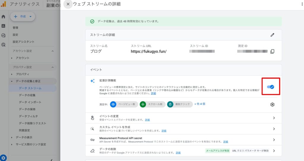 GA4では、Webデータストリームの拡張計測機能で、外部リンククリックなどをコード変更なしで取れます。まず確認します。