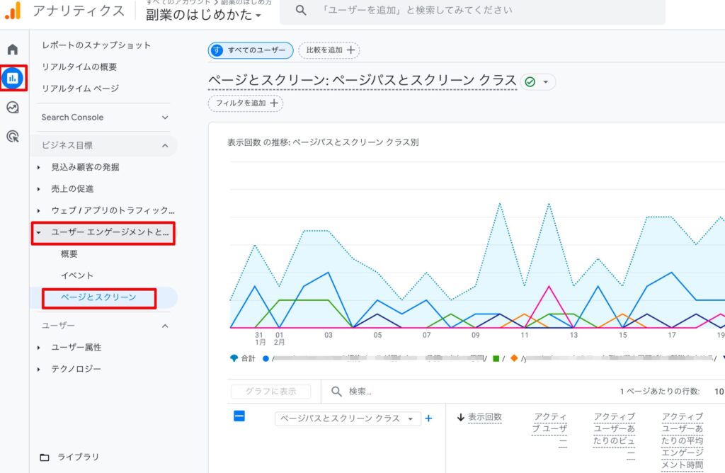 2)記事を見る:レポート → エンゲージメント → ページとスクリーン