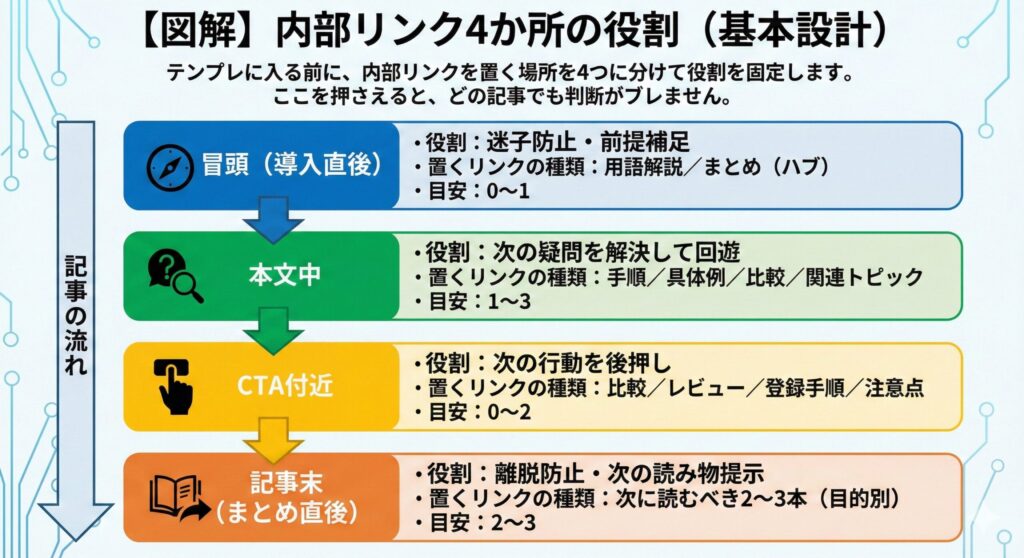 テンプレに入る前に、内部リンクを置く場所を4つに分けて役割を固定します。ここを押さえると、どの記事でも判断がブレません。