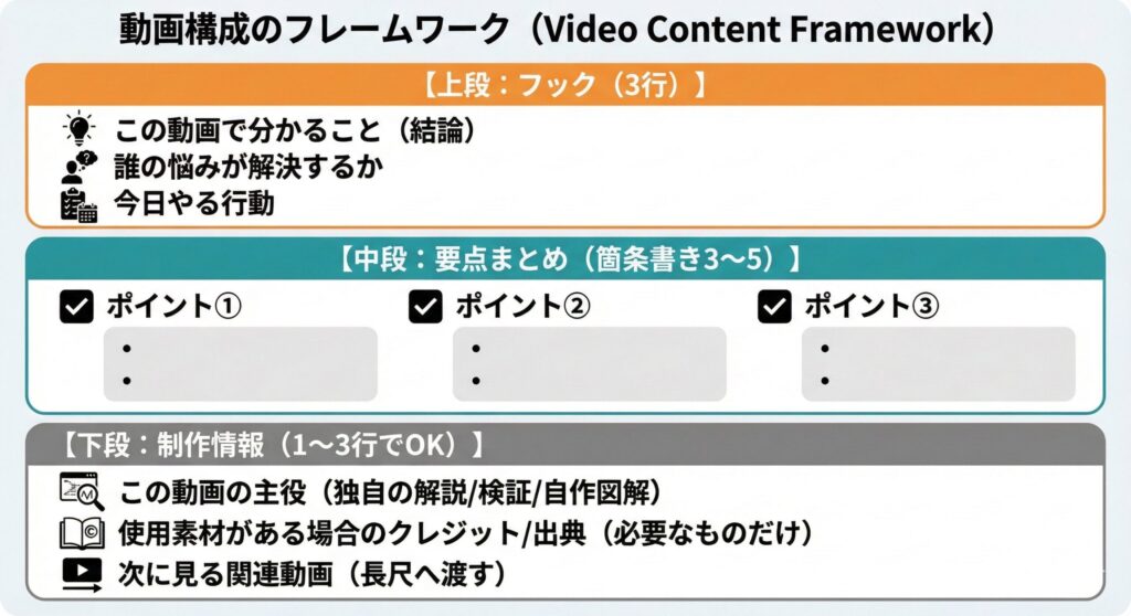 回避策:3段構成(分かること/要点/制作情報)で“動画ごとの中身”を見せる。