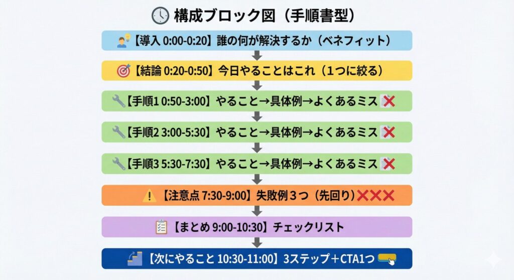 長尺は「話す順番」を固定すると一気にラクになります。尺配分の目安も含めて、ブロック(箱)で考えてください。