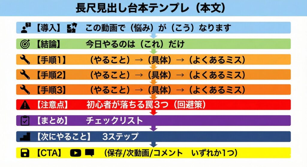ショート中心の運用者が長尺で挫折するのは、根性不足ではなく制作コストの設計が“長尺仕様”になっていないからです。長尺はテレビ番組みたいな演出も、論文みたいな長文台本も不要。伸びている解説系の多くは、決まった型(テンプレ)に情報を流し込んでいるだけです。